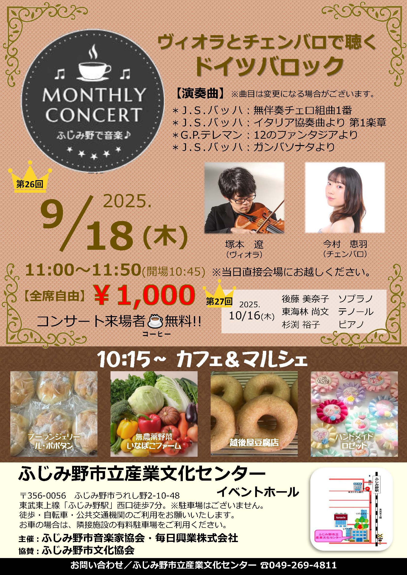 9月のマンスリーコンサートは、「ヴィオラとチェンバロで聴くドイツバロック」です。